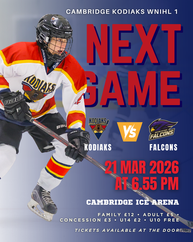Tickets for Cambridge Kodiaks vs MK Falcons on Saturday 21st March 2026. These tickets are only valid for these matches.